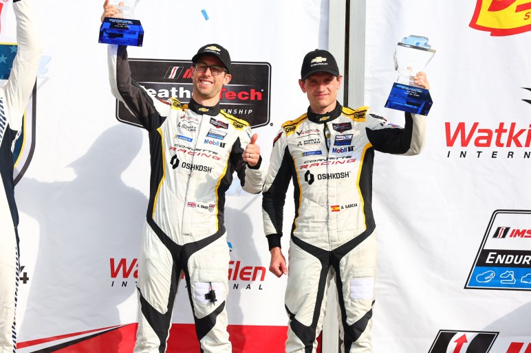 The No. 3 Corvette from Corvette Racing by Pratt Miller Motorsports ran up front in GTD PRO, fell down the order following an early-race brake change and then challenged for the win late in a topsy-turvy enduro at Watkins Glen International that was severely impacted by rain. It was the first podium finish for the Garcia/Sims duo, following a similar finish for the No. 4 Corvette at WeatherTech Raceway Laguna Seca.